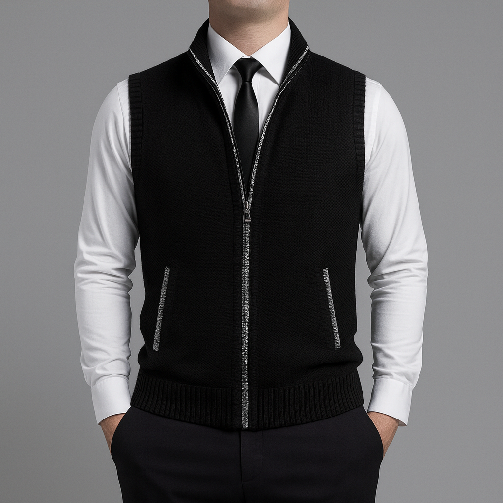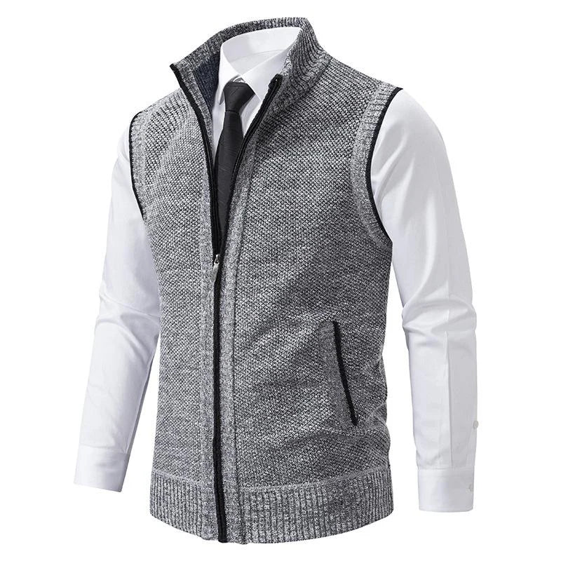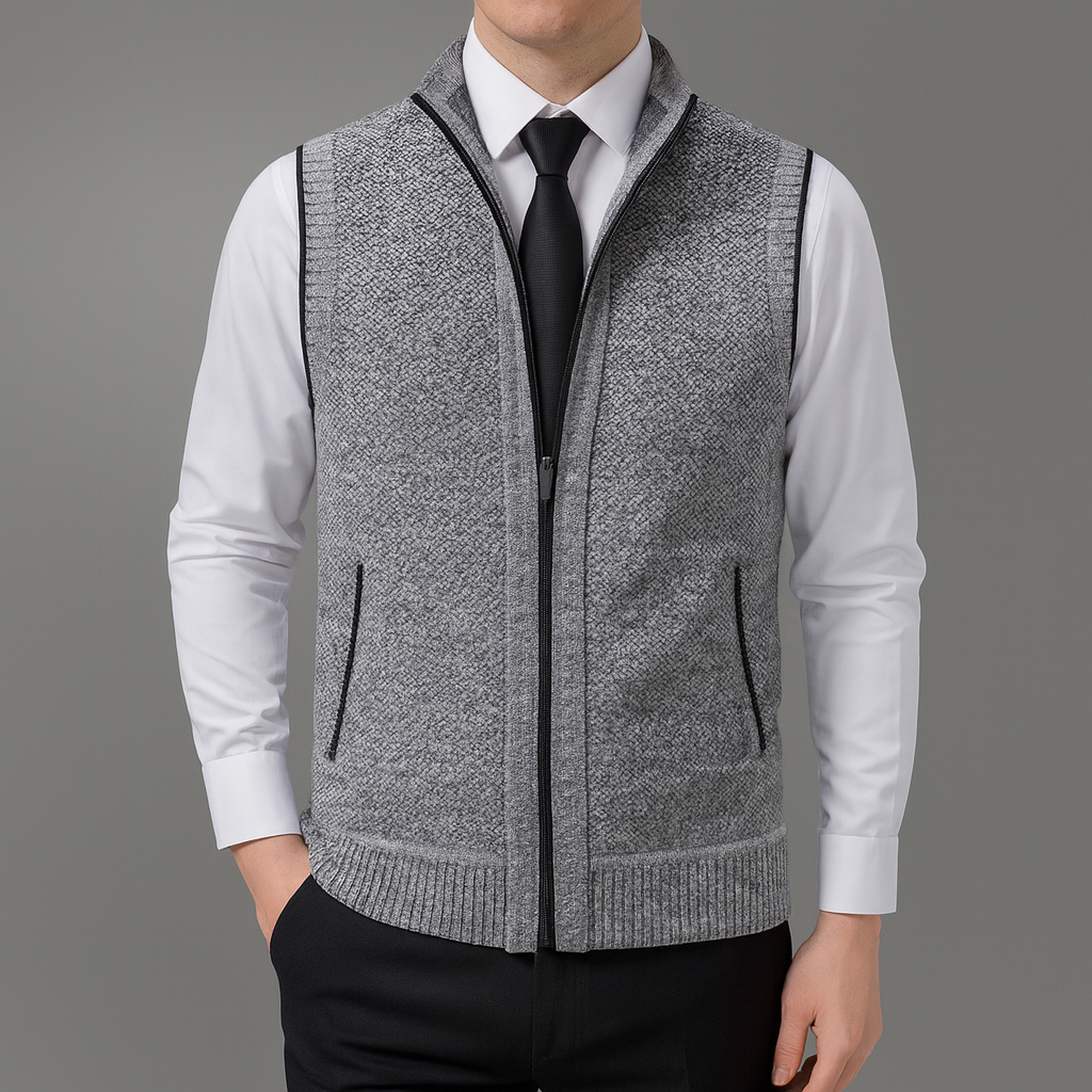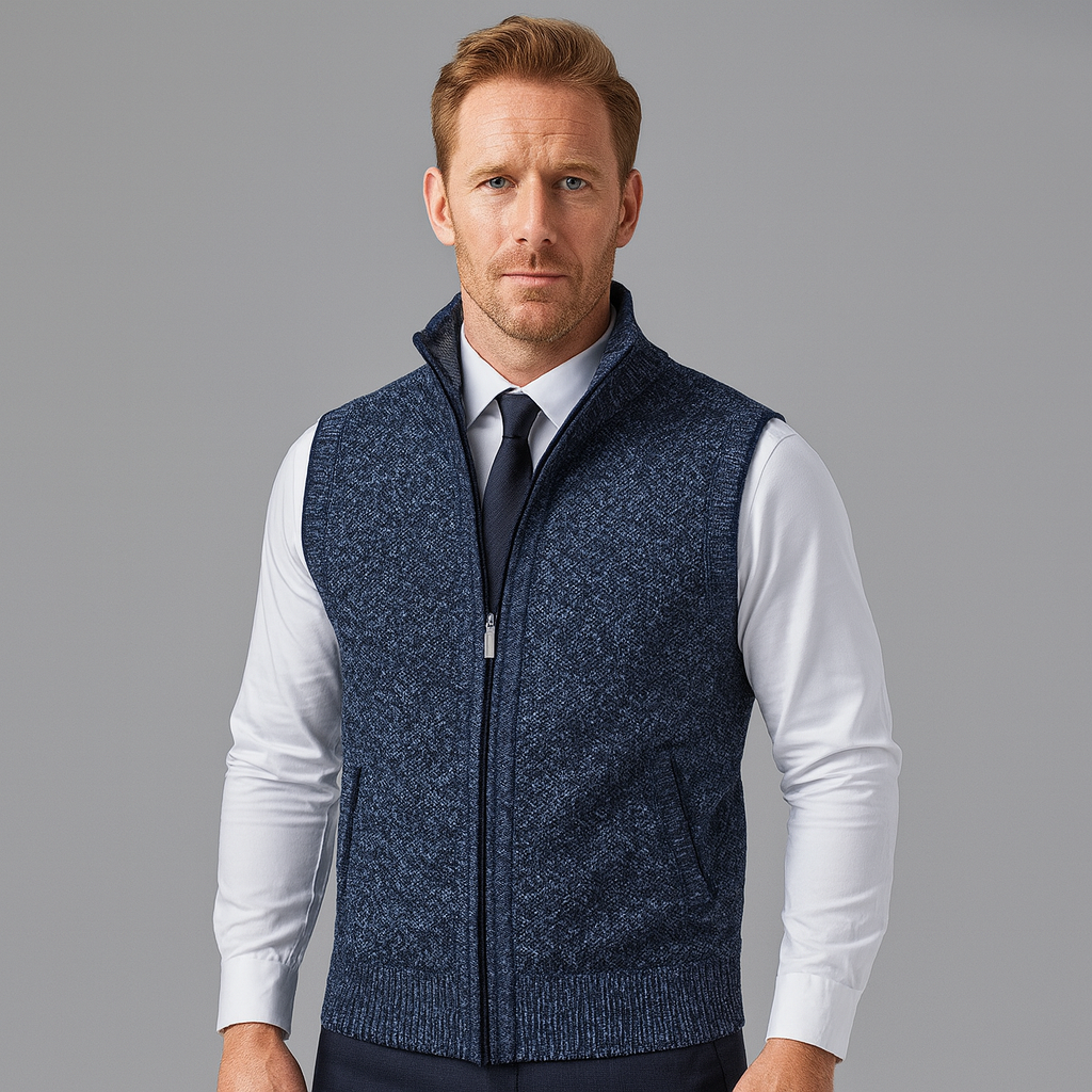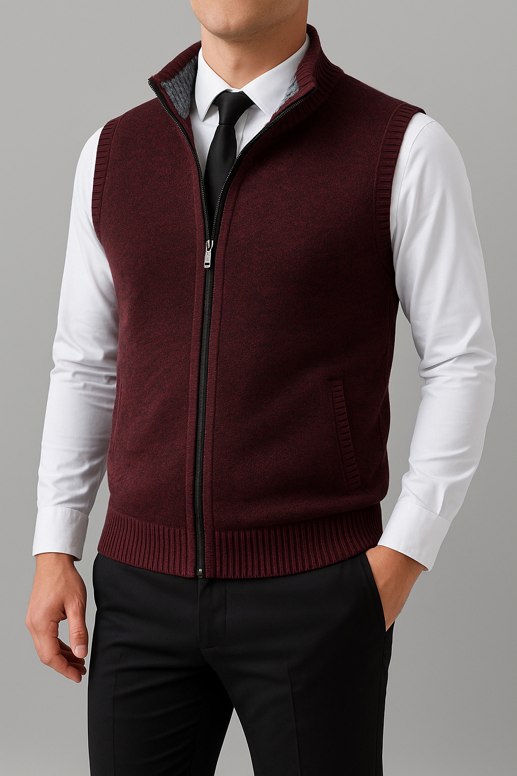 Denna herrväst har en rak passform och en hellång dragkedja. Den uppstående kragen ger extra skydd och en snygg finish. Tyget har en subtil textur som ger designen ett elegant utseende. Tack vare sin enkla design är västen mångsidig och kan matchas med en mängd olika outfits.